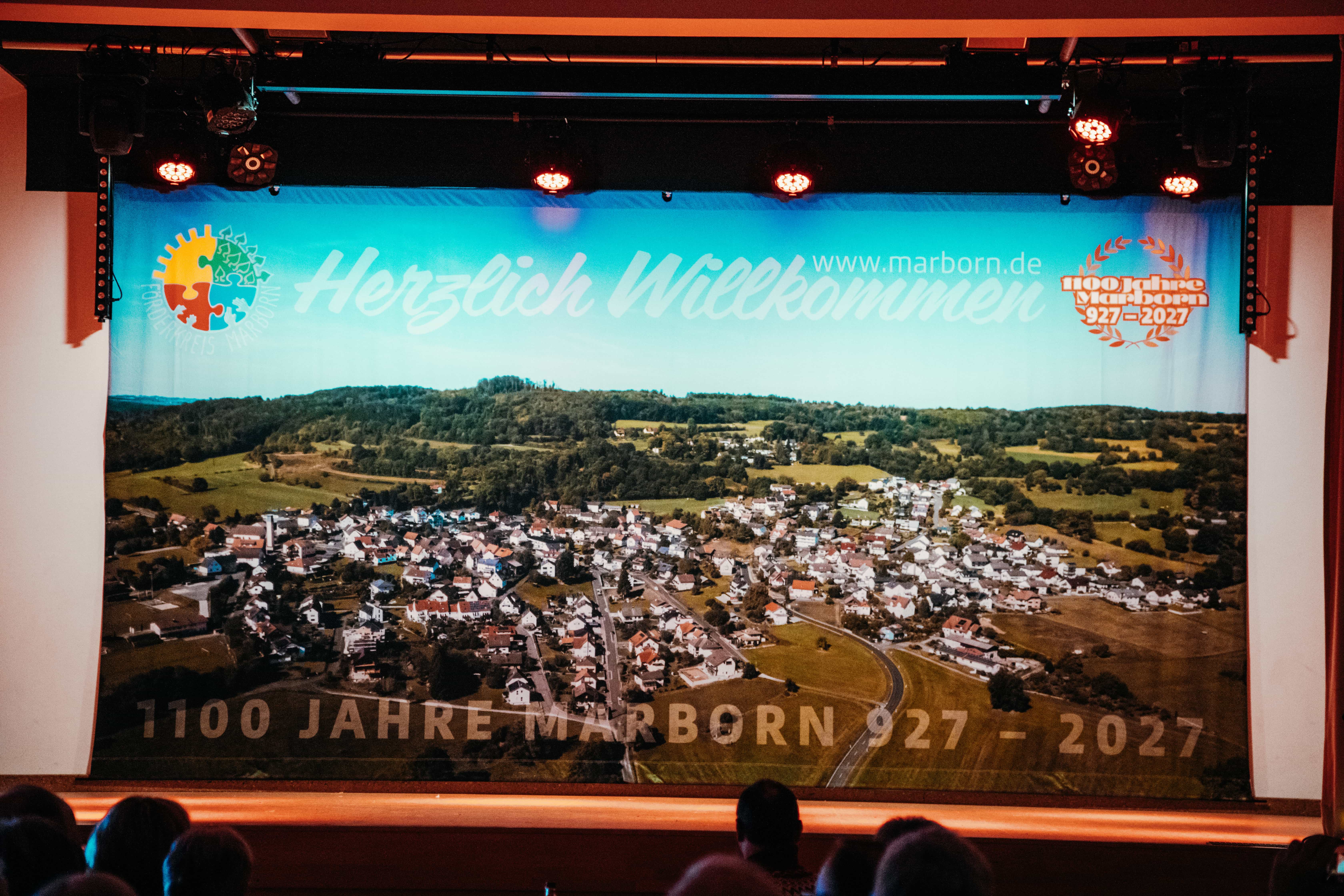 Der Blick wurde aber auch nach vorn gerichtet: 2027 feiert Marborn sein 1100-jähriges Bestehen. Ein neu enthülltes Bühnenbild weist bereits jetzt auf das Jubiläum hin. Gesponsert wurde es von Sigrid Reisinger, die grafische Umsetzung unterstützte Ralf Hofacker mit einer Luftaufnahme des Ortes.