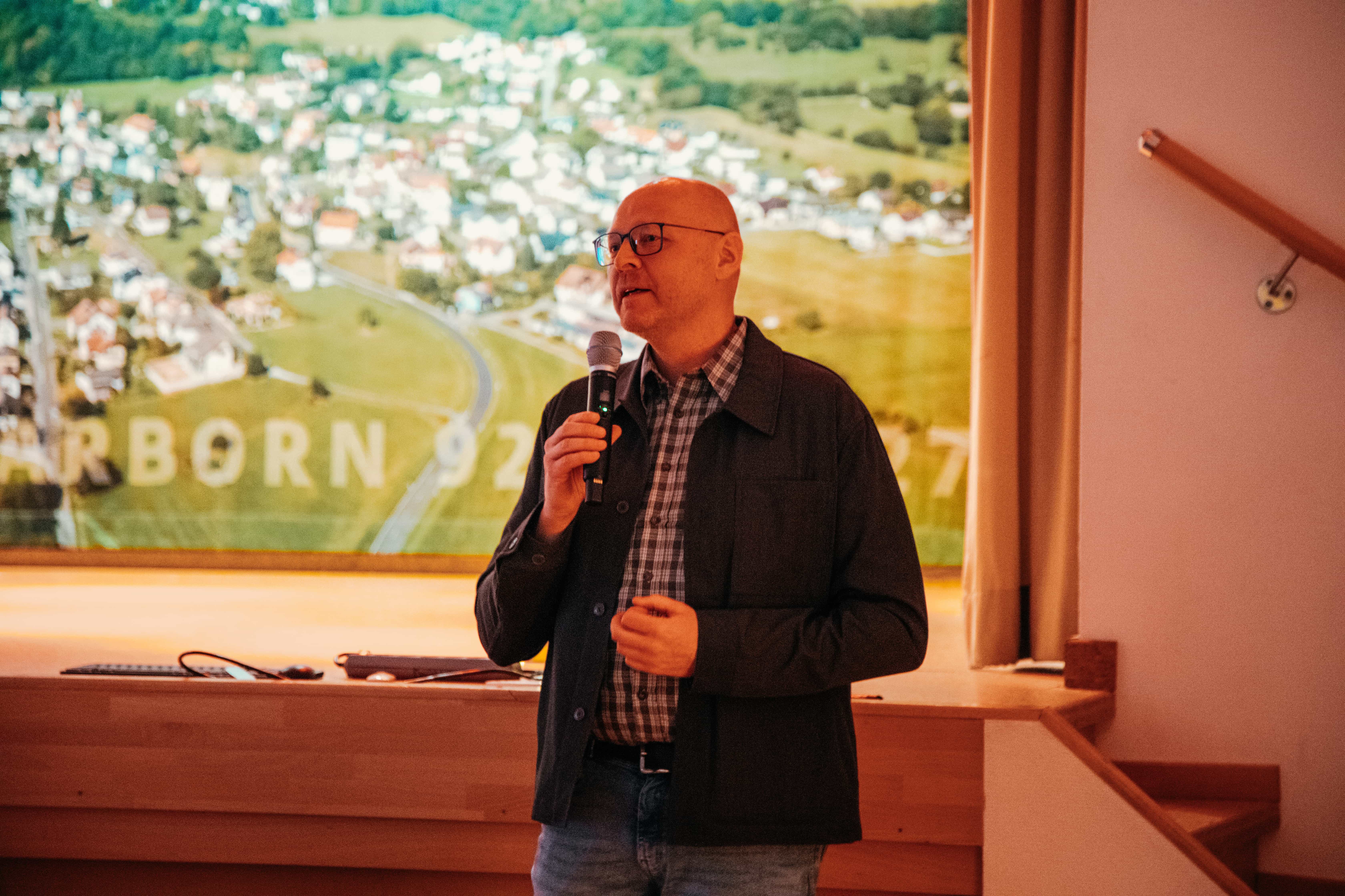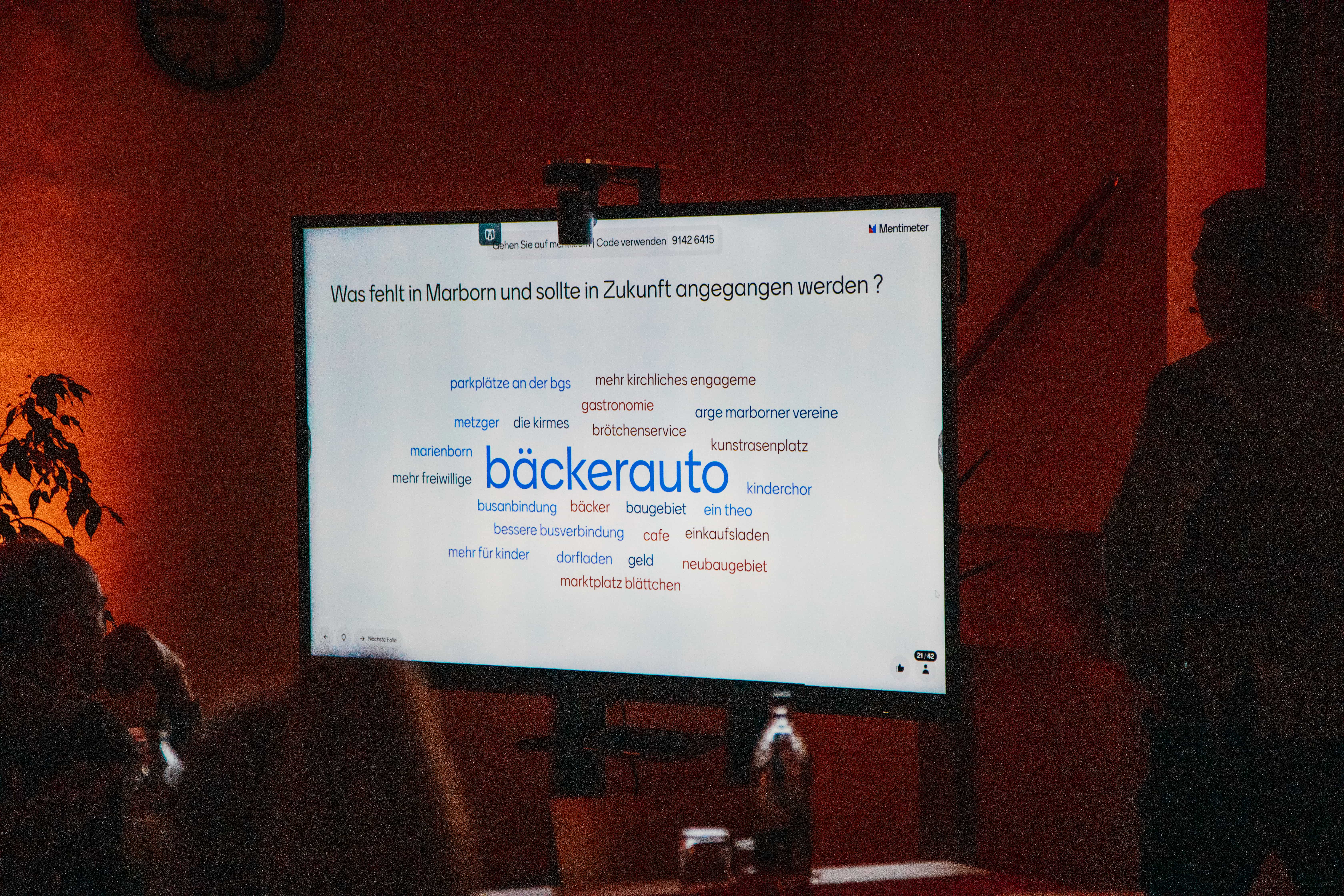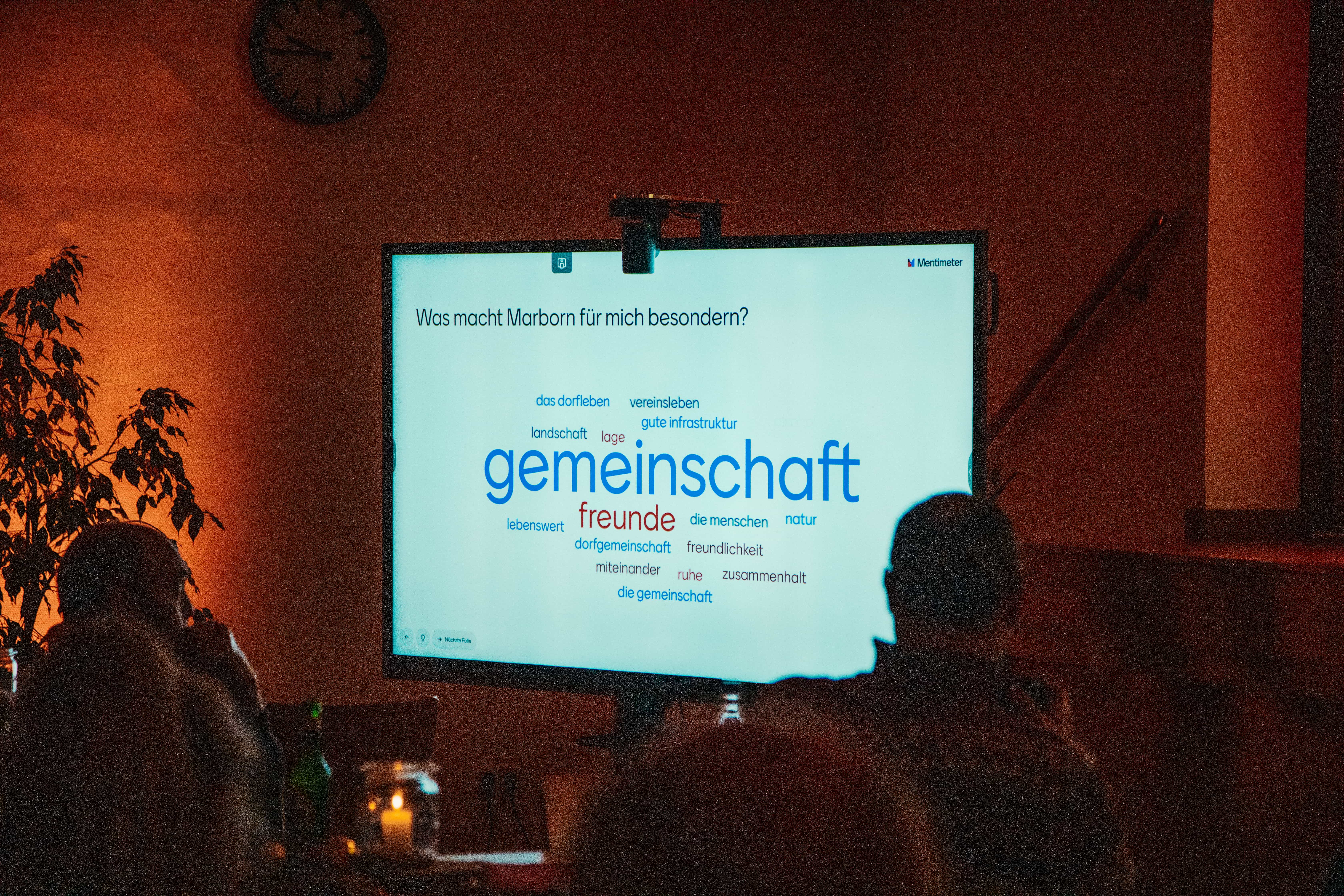 Aktiv eingebunden wurden die Gäste bei einer Ideenwerkstatt zum Jubiläumsjahr. Moderiert von Tim Schätzke der Marketingagentur Gandayo aus Steinau konnten die Teilnehmenden per Smartphone und QR-Code ihre Gedanken einbringen. Auf Fragen wie „Was macht Marborn für mich besonders?“, „Was fehlt in Marborn?“ oder „Was darf beim Jubiläum nicht fehlen?“ entstanden live sichtbare Wortwolken. Das Erleben von Gemeinschaft wurde besonders positiv hervorgehoben, wohingegen als fehlend zum Beispiel ein „Bäckerauto“, ein „Dorfladen“ oder ein „Café“ genannt wurden. Beim Jubiläum sollten traditionelle Veranstaltungen wie Kirmes und Fasching, aber auch Ideen wie ein eigenes Lied oder eine Dorfchronik nicht fehlen.