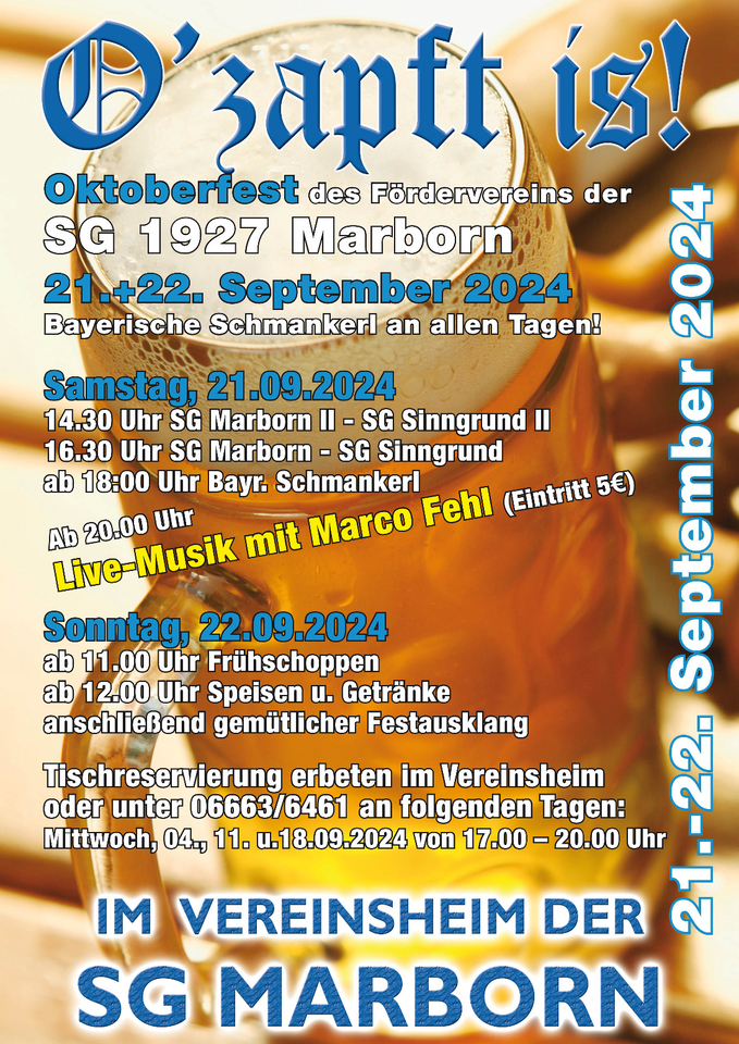 202409 oktoberfestWir freuen uns auf Euren Besuch beim diesjährigen Oktoberfest des Fördervereins der SG Marborn im Vereinsheim.