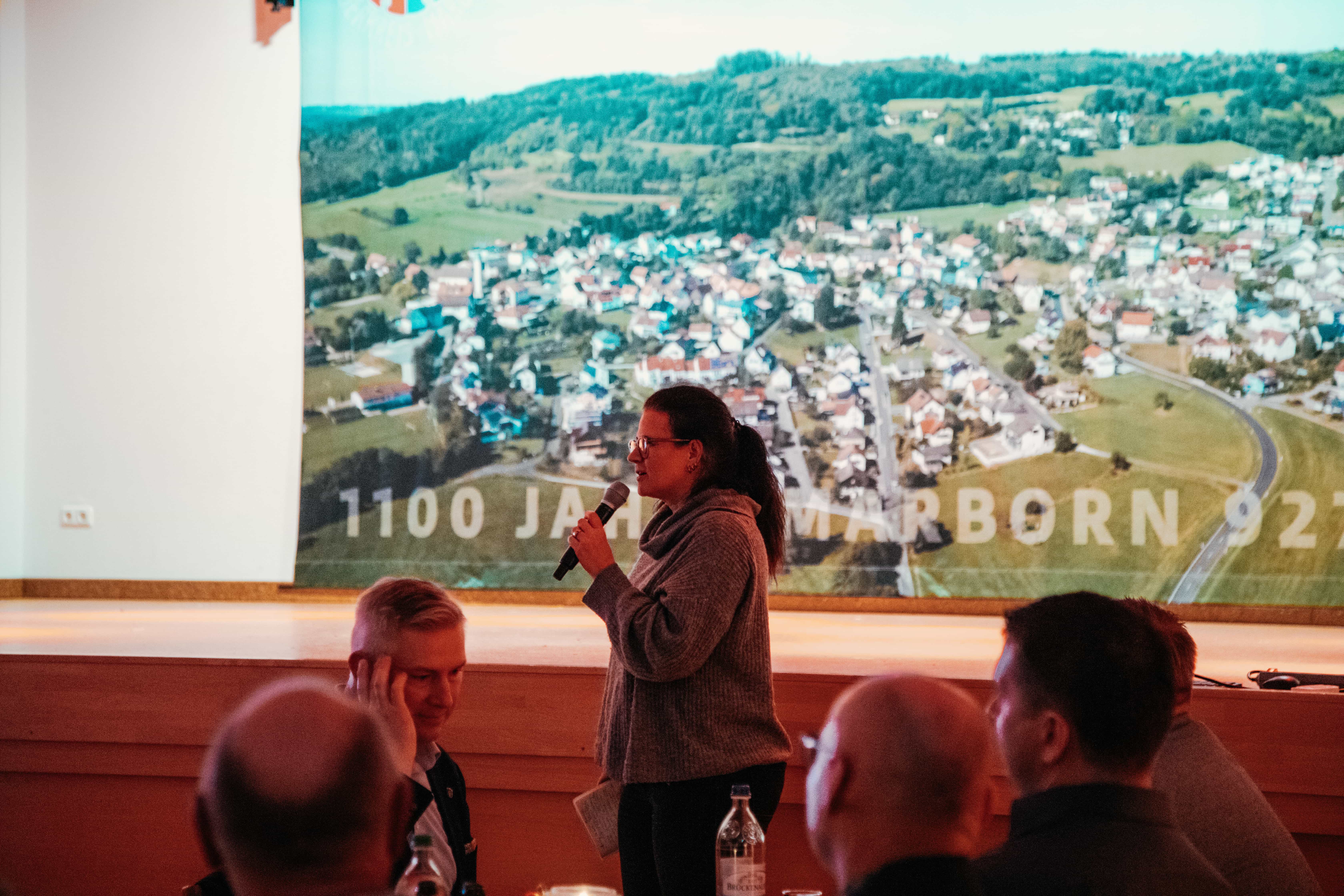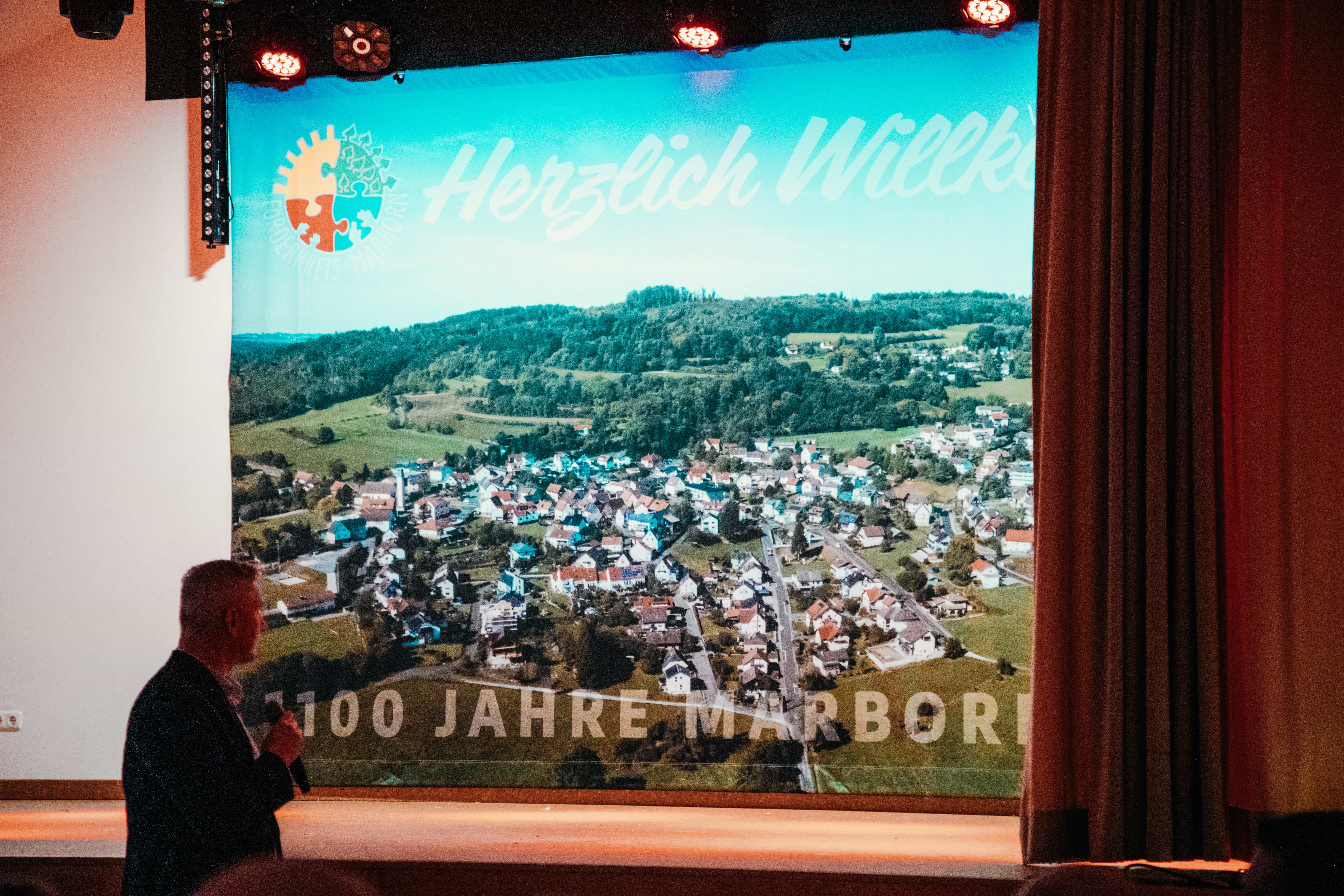 Der Blick wurde aber auch nach vorn gerichtet: 2027 feiert Marborn sein 1100-jähriges Bestehen. Ein neu enthülltes Bühnenbild weist bereits jetzt auf das Jubiläum hin. Gesponsert wurde es von Sigrid Reisinger, die grafische Umsetzung unterstützte Ralf Hofacker mit einer Luftaufnahme des Ortes.