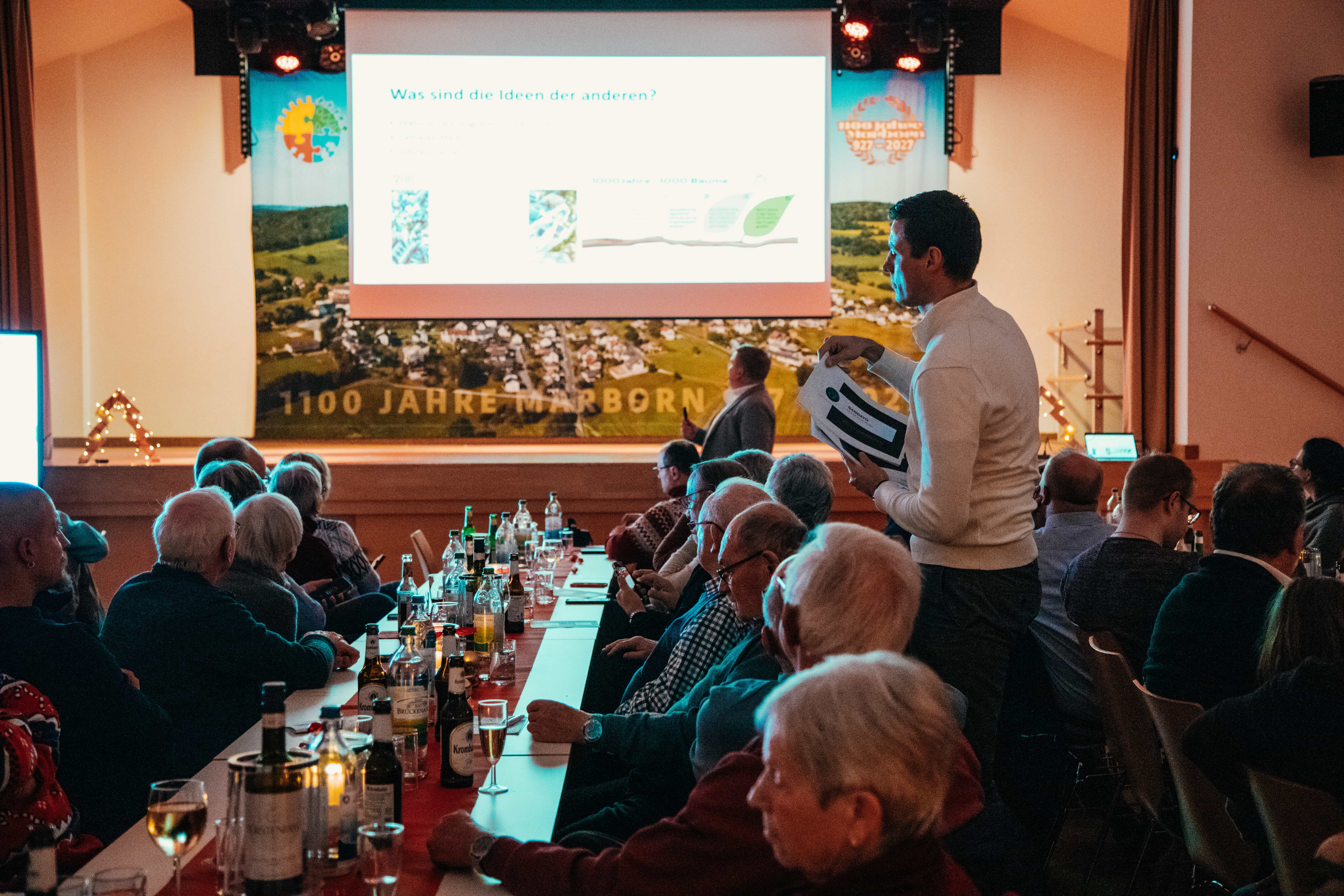 Aktiv eingebunden wurden die Gäste bei einer Ideenwerkstatt zum Jubiläumsjahr. Moderiert von Tim Schätzke der Marketingagentur Gandayo aus Steinau konnten die Teilnehmenden per Smartphone und QR-Code ihre Gedanken einbringen. Auf Fragen wie „Was macht Marborn für mich besonders?“, „Was fehlt in Marborn?“ oder „Was darf beim Jubiläum nicht fehlen?“ entstanden live sichtbare Wortwolken. Das Erleben von Gemeinschaft wurde besonders positiv hervorgehoben, wohingegen als fehlend zum Beispiel ein „Bäckerauto“, ein „Dorfladen“ oder ein „Café“ genannt wurden. Beim Jubiläum sollten traditionelle Veranstaltungen wie Kirmes und Fasching, aber auch Ideen wie ein eigenes Lied oder eine Dorfchronik nicht fehlen.